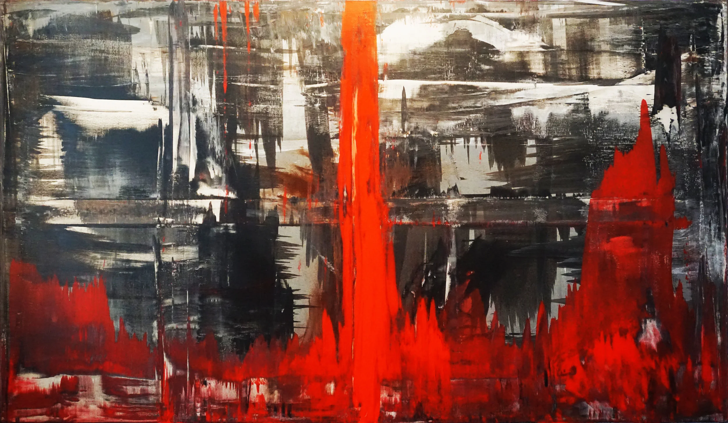 "Attention Economy" is unlike Jackson Pollock paintings except in its vehement, even violent expressivity. Employing a Gerhard Richter squeegee technique, with this abstract painting I verge into a more chaotic realm than Richter's measured works usually do. "Attention Economy" is not only a reflection on, but an exact depiction of the fleeting nature of the "value" of social media popularity.